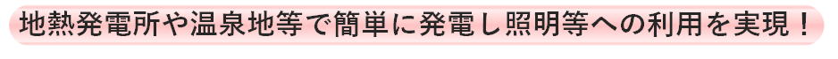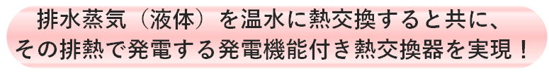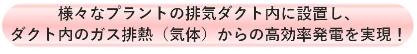 | ➊ 優れたコストパフォーマンス - 独自工法による二重管構造で、高熱回収効率 - 発電機のような可動部分がなく、維持費を大幅削減 - わずかな蒸気(0.2t/h)からでも、発電可能 ➋ 本数を変え、広範囲の熱源規模に対応可能 ❸ 短期での投資回収が可能 -投資回収期間:量産時 5年(省エネ助成金活用) -耐用年数:発電ユニット 20年、電源回路 10年 -仕様- 出力 : 1ユニット; 6kW ※150W/本×40本 ★システム拡張例 7ユニット;約40kW(AC100/200V) -用途- 工場内電力(制御盤、周辺機器、非常電源、 他) |